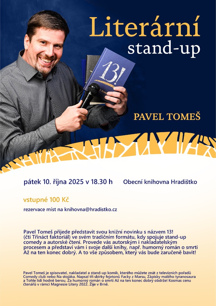 V pátek 10. října od 18:30 hodin naši knihovnu navštíví Pavel Tomeš se svým literárním stand-upem.